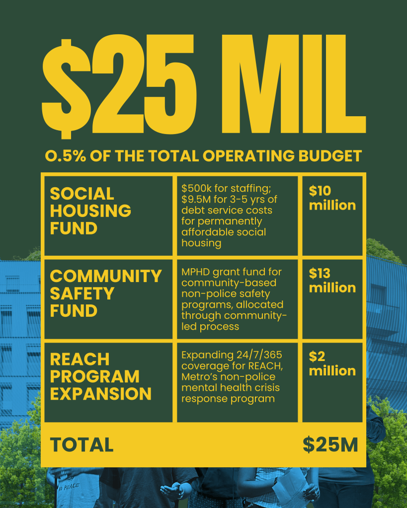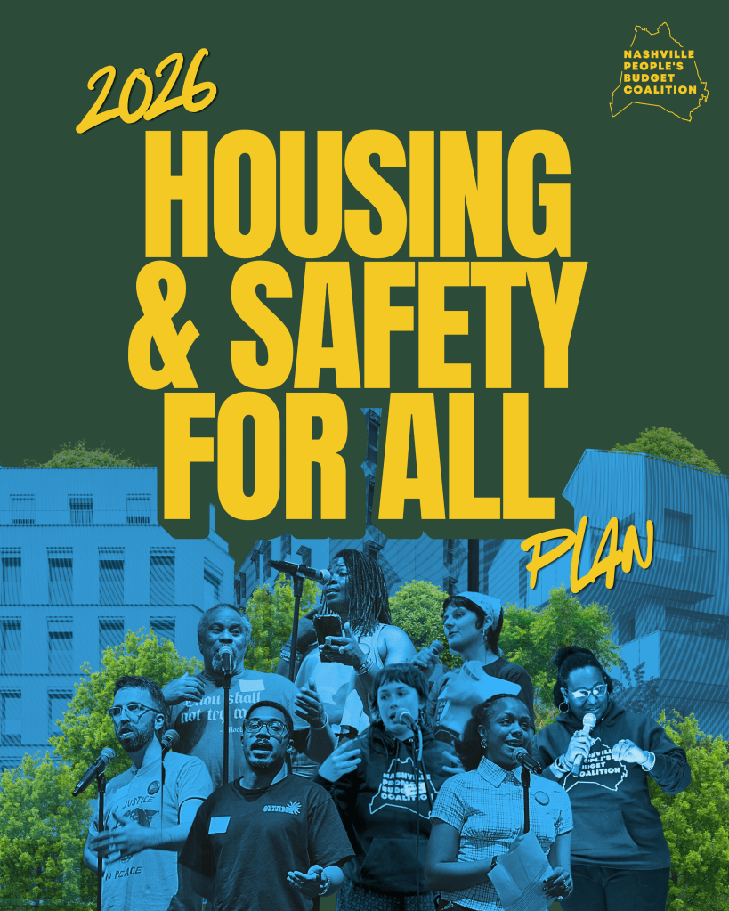 The 2026 Housing & Safety for All Plan, developed by the Nashville People’s Budget Coalition through direct engagement with thousands of directly impacted Nashville residents, is a $25 million plan — 0.5% of the total operating budget — to lay the foundations necessary to guarantee permanently affordable housing and genuine community safety for all Nashvillians.