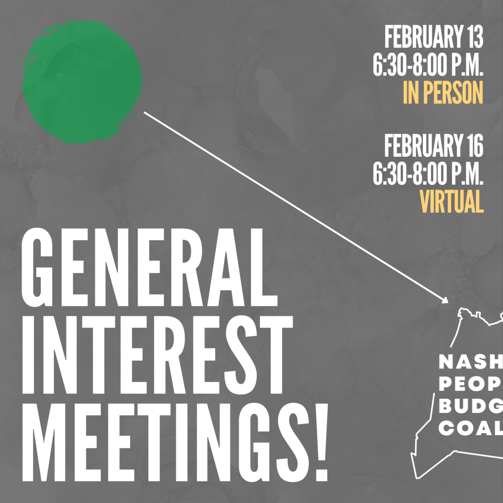 The Nashville People’s Budget Coalition is now a member-based organization! We are holding interest meetings to share about our history, our present, and how you can contribute as a member to our shared future!