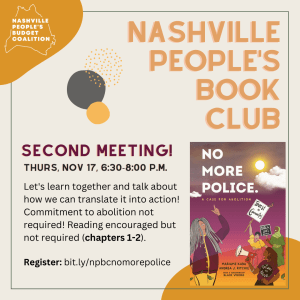 Our first three meetings of the Nashville People’s Book Club were full of generative conversation as we connected the dots between No More Police: A Case for Abolition and what we’re seeing with regards to policing in Nashville. Our final three meetings will be: